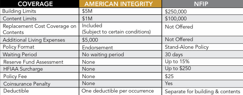 The chart below details the differences between AI’s program and that offered by the NFIP: